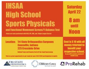 Posted on Apr 11, 2017 High School Sports Physical Day 2017 Our annual High School Sports Physical Day is scheduled for Saturday, April 22nd from 8am - noon at Tri-State Orthopaedics. Athletes will receive a physical screening from primary care providers (... Read More
