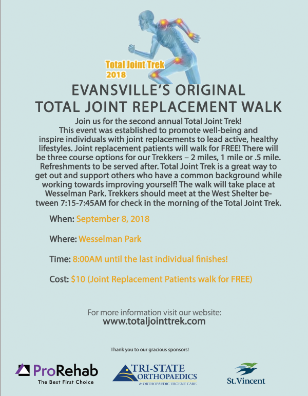 Join us at Wesselman Park on September 8, 2018 at 8:00 a.m. for the second annual Total Joint Trek. The walk is free for all joint replacement patients and $10 for family and friends. The registration form can be turned in to any ProRehab or Tri-State Orthopaedics location. To find out more about the event, visit http://www.totaljointtrek.com/.